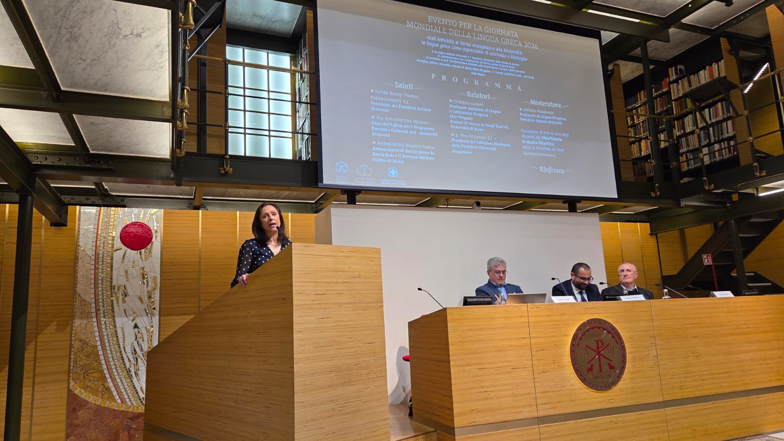 Στην Αιώνια Πόλη, επίσης, εκδήλωση για τη Διεθνή Ημέρα Ελληνικής Γλώσσας συνδιοργανώθηκε από την πρεσβεία της χώρας μας παρά την Αγία Έδρα, την Αποστολική Διακονία της Εκκλησίας της Ελλάδος και το Πανεπιστήμιο Pontificio Istituto Orientale.